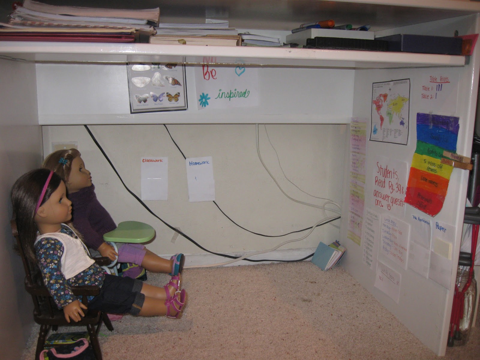 One of my favorite things to do with my dolls is play school. I teach McKenna and Julie, who are in fourth grade. My doll school is under my desk, but I love it anyway!